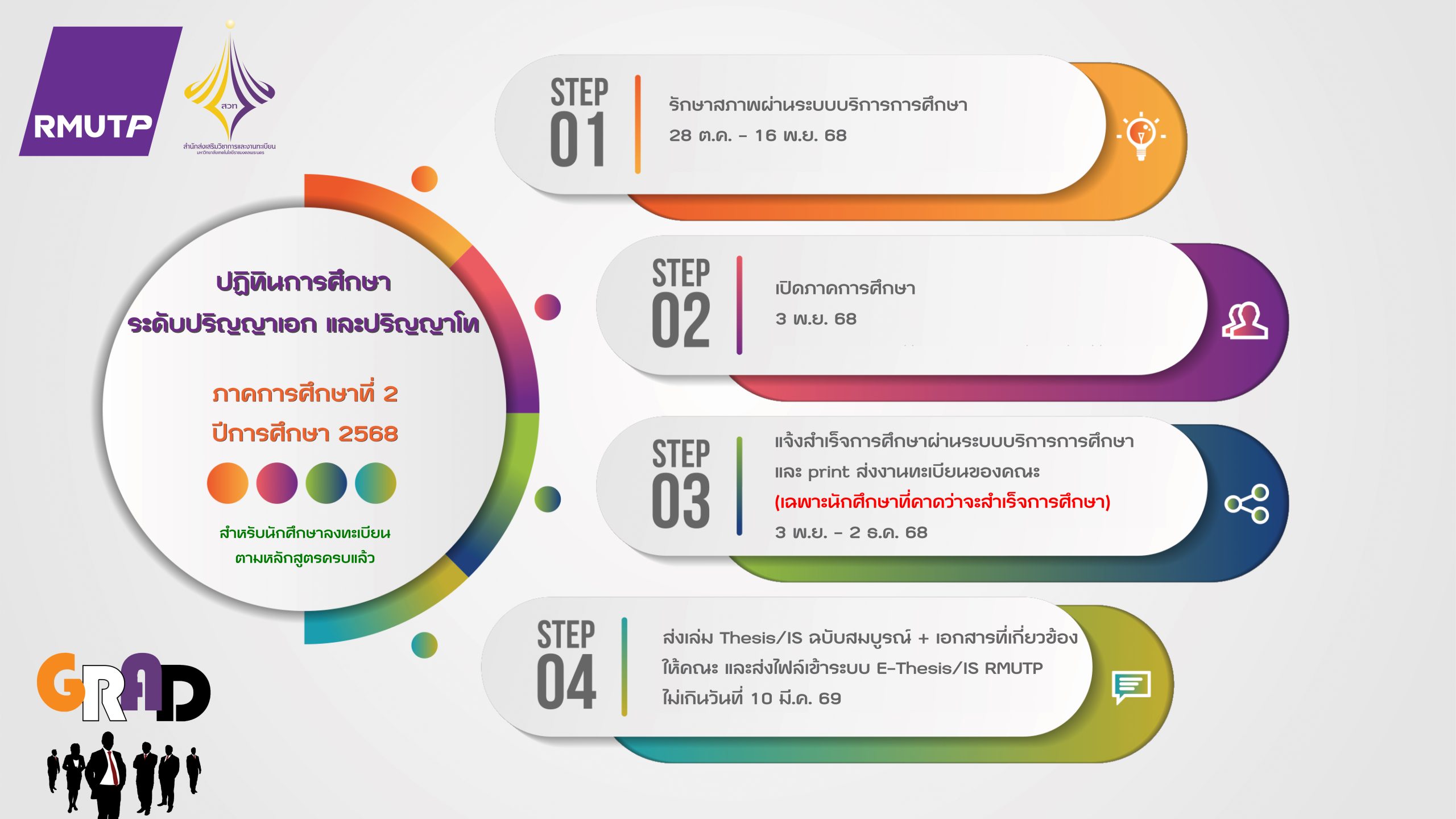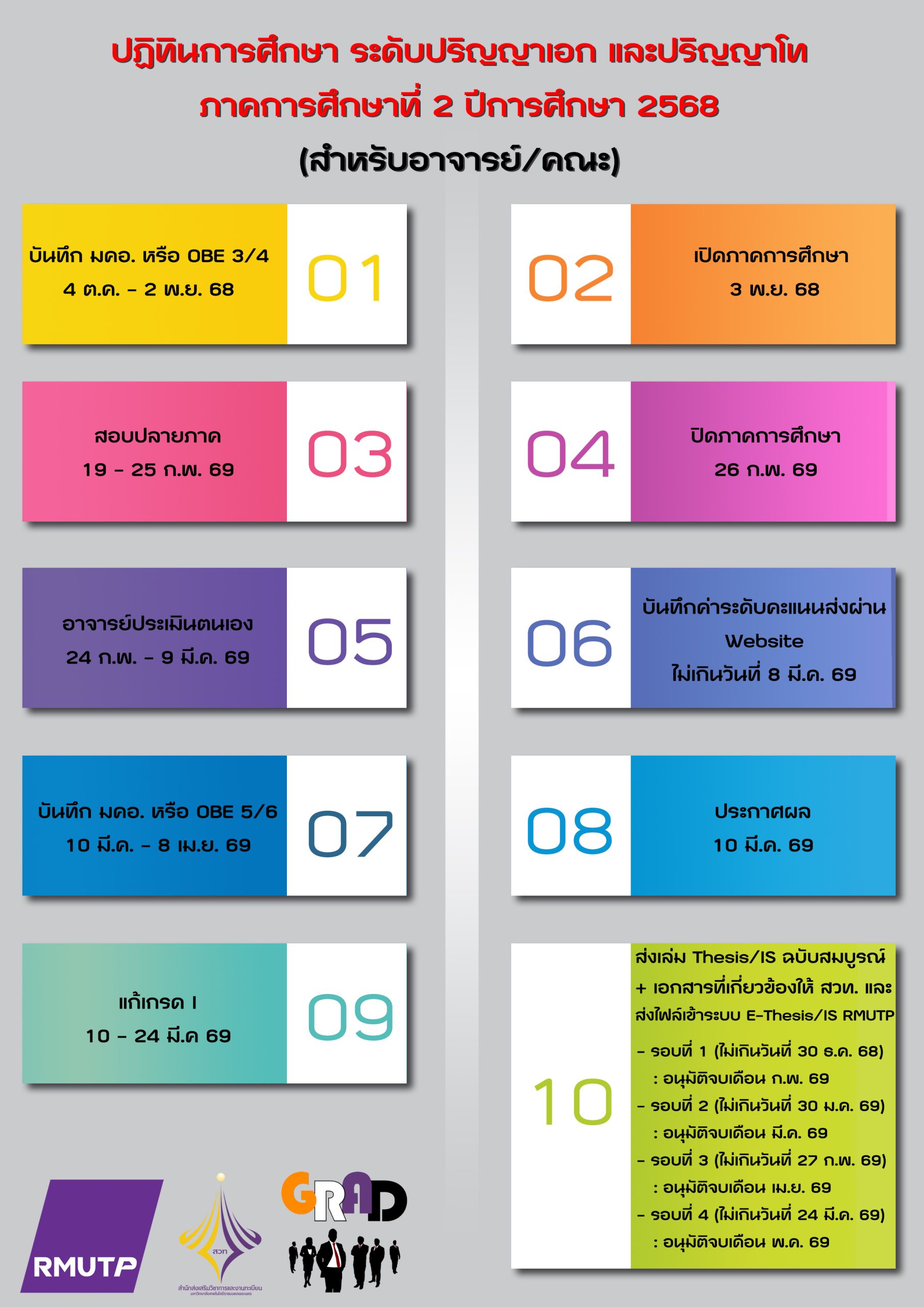 ข่าวประชาสัมพันธ์ ปฏิทินการศึกษา ระดับปริญญาเอก และปริญญาโท ภาคการศึกษาที่ 2 ปีการศึกษา 2568 Posted ตุลาคม 14, 2025ตุลาคม 14, 2025 admin_graduate >> Download ปฏิทินการศึกษา : https://reg.rmutp.ac.th <<