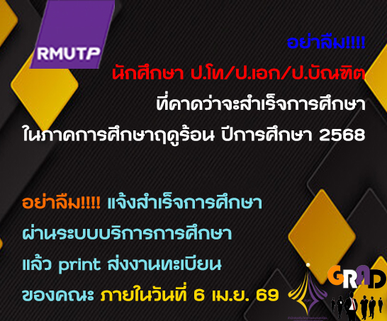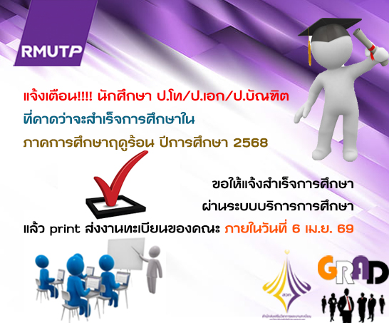 แจ้งเตือน!!!! นักศึกษา ป.โท/ป.เอก/ป.บัณฑิต ที่คาดว่าจะสำเร็จการศึกษาในภาคการศึกษาฤดูร้อน ปีการศึกษา 2568